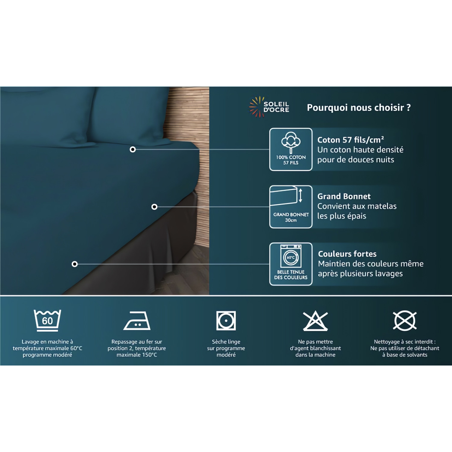 Drap housse uni en pur coton 57 fils/cm2, pour grand lit 2 places. Bonnet de 30 cm, s'adapte a toutes les épaisseurs de matelas. Facile d’entretien, doux et souple. Nous vous assurons une belle tenue des couleurs et vous conseillons un lavage en machine à 60 degrés.