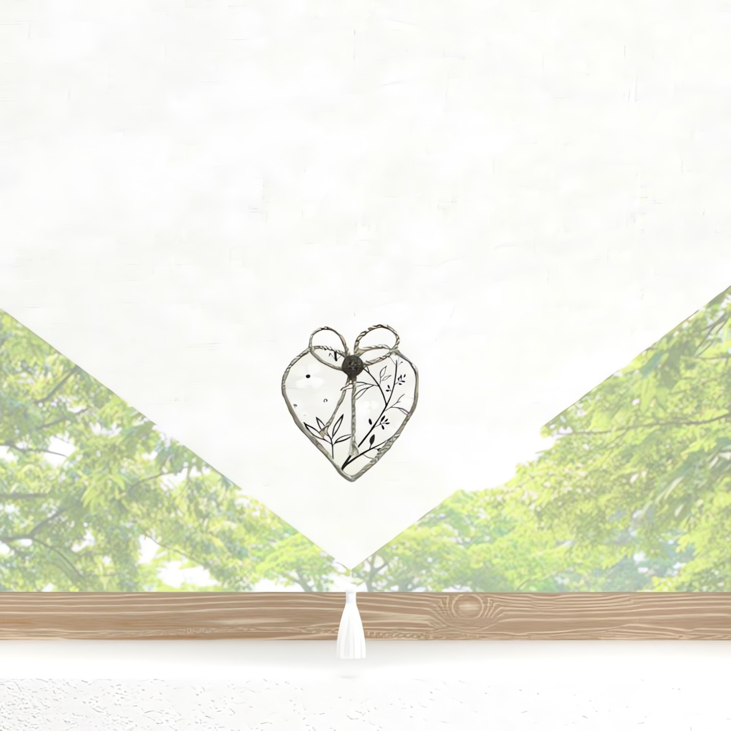 Patch en forme de coeur, ruban en jute et pompon comme éléments décoratifs.