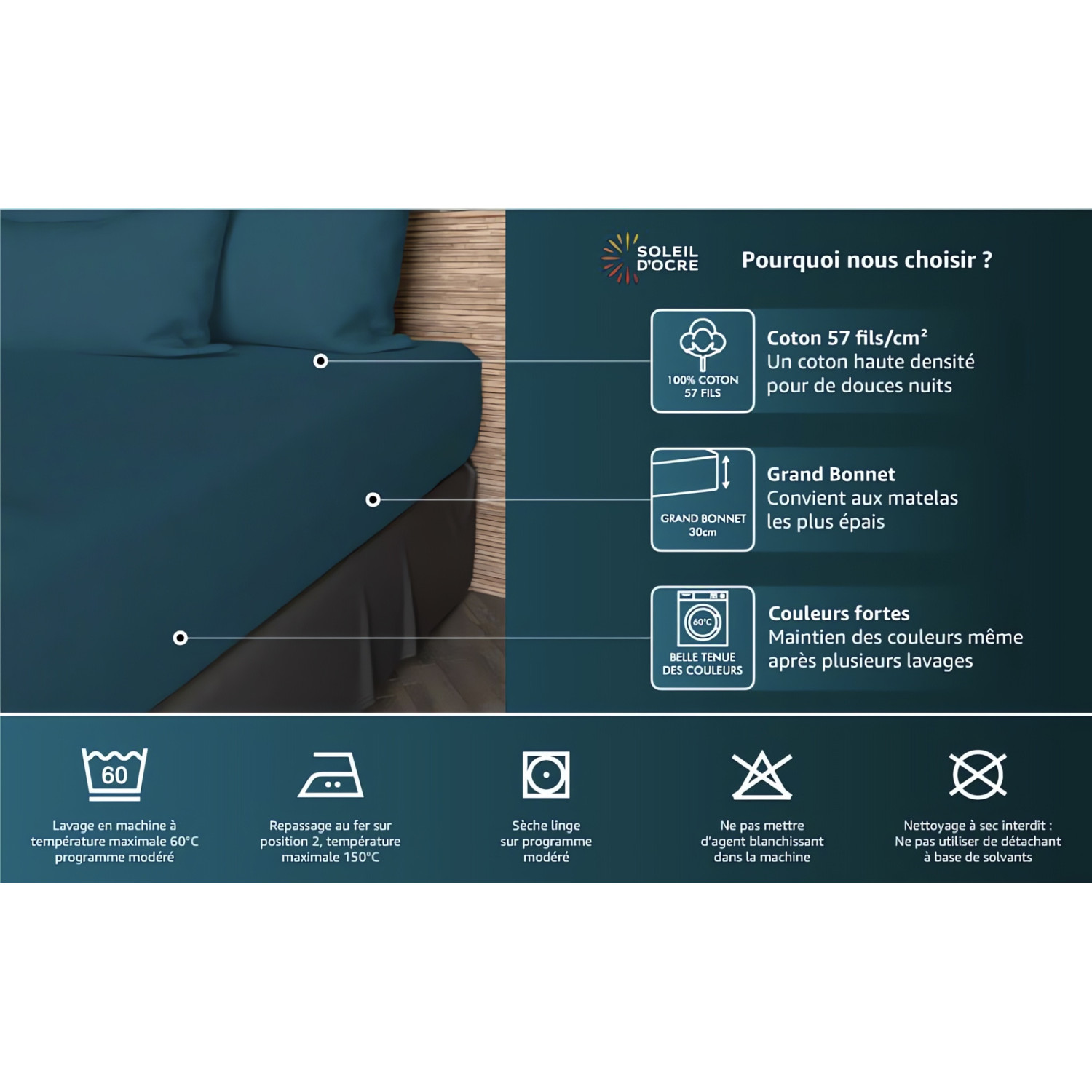 Drap housse uni en pur coton 57 fils/cm2, pour grand lit 2 places. Bonnet de 30 cm, s'adapte à toutes les épaisseurs de matelas. Facile d’entretien, doux et souple. Nous vous assurons une belle tenue des couleurs et vous conseillons un lavage en machine à 60 degrés.