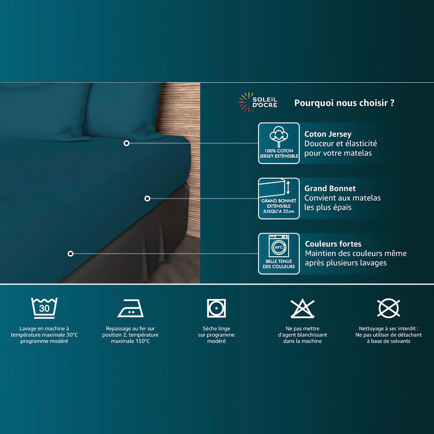 Drap housse jersey extensible uni en pur coton, pour lit 2 places. Bonnet de 25 cm extensible jusqu'à 32 cm, s'adapte a toutes les épaisseurs de matelas. Facile d’entretien, doux et souple. Nous vous assurons une belle tenue des couleurs et vous conseillons un lavage en machine à 60 degrés.