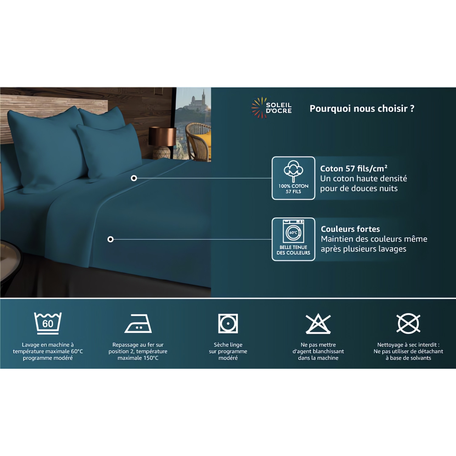 Drap plat uni en pur coton 57 fils/cm2, pour lit 2 places. Facile d’entretien, doux, souple. Nous vous assurons une belle tenue des couleurs et vous conseillons un lavage en machine à 60 degrés.